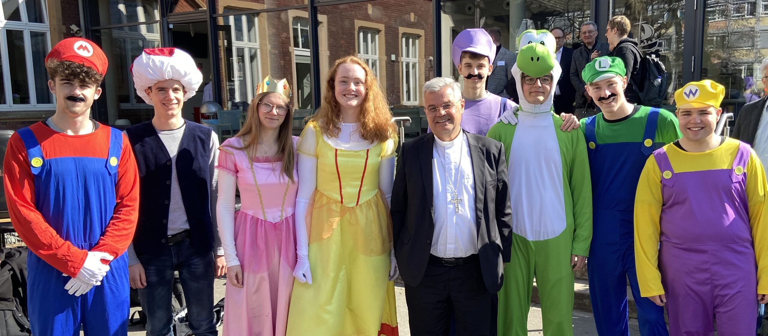 Die außergewöhnlichste Begegnung des Tages fand aber mit der Q2 statt, die aktuell ihre Mottowoche feiert und es sich nicht nehmen ließ, auch einige Bilder mit dem Erzbischof zusammen zu machen und auch gemeinsam zu feiern.