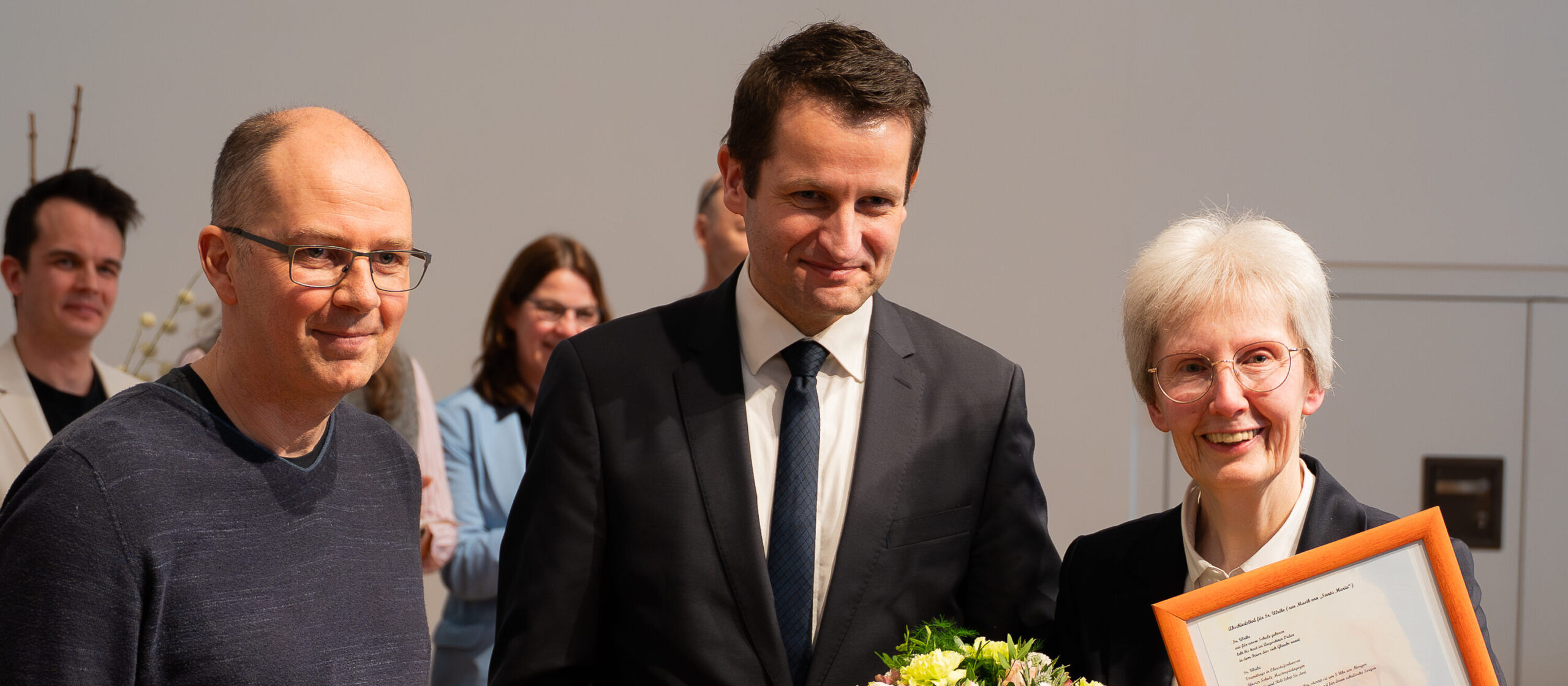 Mitglieder des Lehrerrats gestalteten den Abschiedsgruß des Kollegiums als Abiturklausur – einem Format, mit dem Sr.M.Ulrike im Rahmen ihrer Funktionsstelle mehr als vertraut gewesen ist. Das Gremium hatte im Vorfeld O-Töne des Kollegiums als Konglomerat von Sr. M. Ulrikes Eigenschaften gesammelt, aus dem sie folgende Charakterzüge exemplarisch vorstellten: „Menschliche Wärme / Empathie: Der Blick für alle Schülerinnen, Schüler und das Kollegium wird fehlen“; „Fels in der BRANDung: Verlässlichkeit und Kompetenz“; „Brückenbauerin zwischen zwei Welten: lebendiges Bindeglied, Bildung mehr als nur Vermittlung von Fakten, eine Ära endet“.