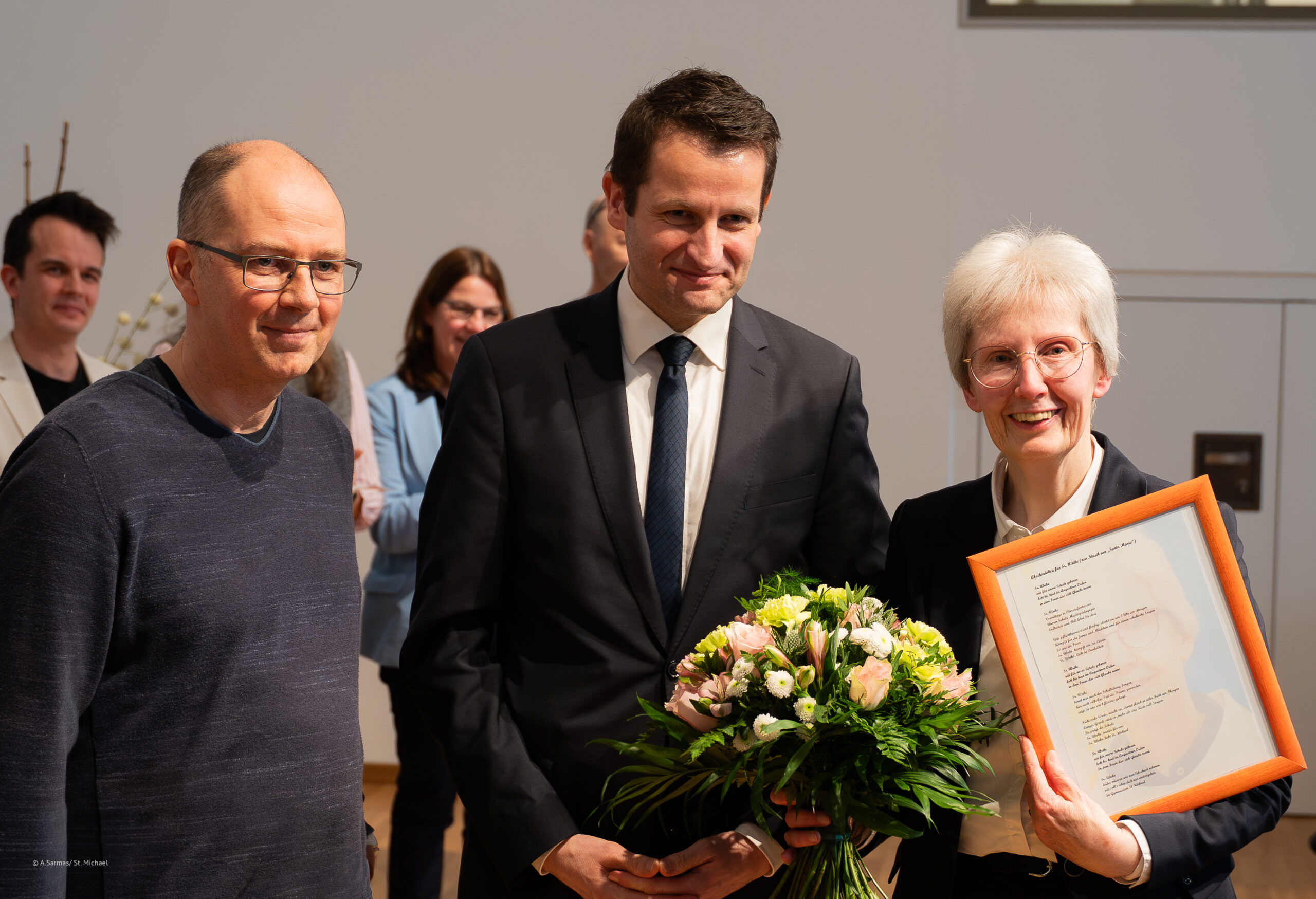 Die Mitglieder des Schulpastoralkreises, der – so Schulseelsorgerin Bettina Schmidt – für die Vernetzung der drei Schulen St. Michael auf spiritueller Ebene stehe, überreichten Sr. M. Ulrike eine Pflanze mit besonderen Wünschen, die auf Papierblüten geschrieben wurden. Auch die Vertreterinnen der Elternschaft, der SV und VeSch bedankten sich bei Sr. M. Ulrike für ihr immer offenes Ohr bei allen Fragen und Problemen. Die Vertreter des Elternfördervereins schlossen zudem mit dem Wunsch, dass der gute und besondere Geist der Ordensfrauen auch nach dem Fortgang der letzten Ordensschwester an St.Michael Bestand haben möge.