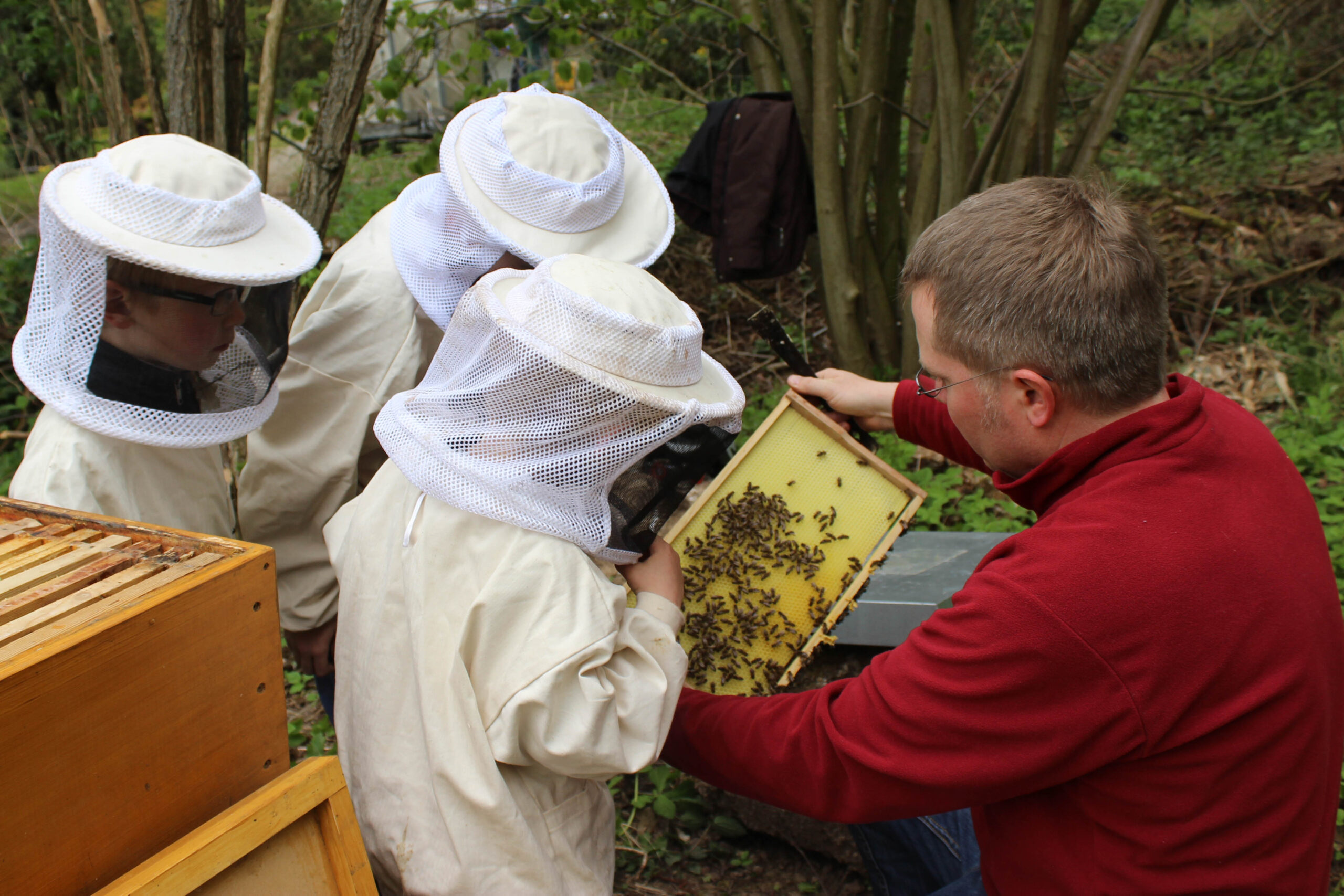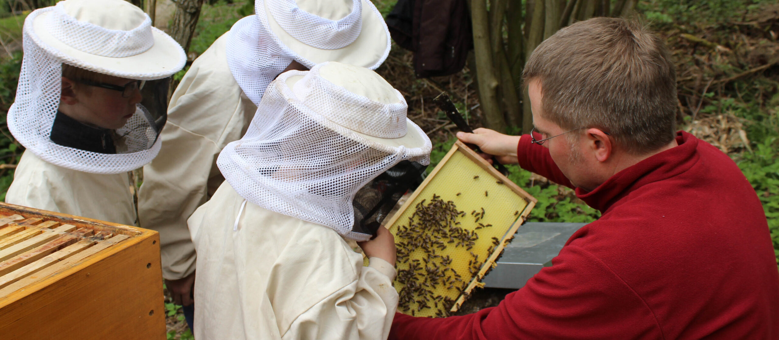 Am St.-Ursula-Gymnasium in Neheim pflegen und erforschen im Projekt Mensch.Biene.Natur seit Sommer 2019 16 Schülerinnen und Schüler drei Bienenvölker. „Wir möchten unseren Schülern mit unserem Bienen-Projekt einen motivierenden und verantwortungsvollen Zugang zur Natur und zu Themen der Nachhaltigkeit ermöglichen. Der Zugang soll stark handlungsorientiert sein und den Jugendlichen zugleich das Thema ‚Bewahrung der Schöpfung‘ praktisch nahebringen“, erklärt Lehrer Dr. Julian Bette. „Die Honigbiene ist dabei als ‚Türöffner‘ zum Verständnis der Komplexität der Schöpfung hervorragend geeignet“, erläutert der Biologielehrer, der zusammen mit seinem Kollegen Wilfried Budde das Projekt leitet. Wilfried Budde ist auch Hobby-Imker.
