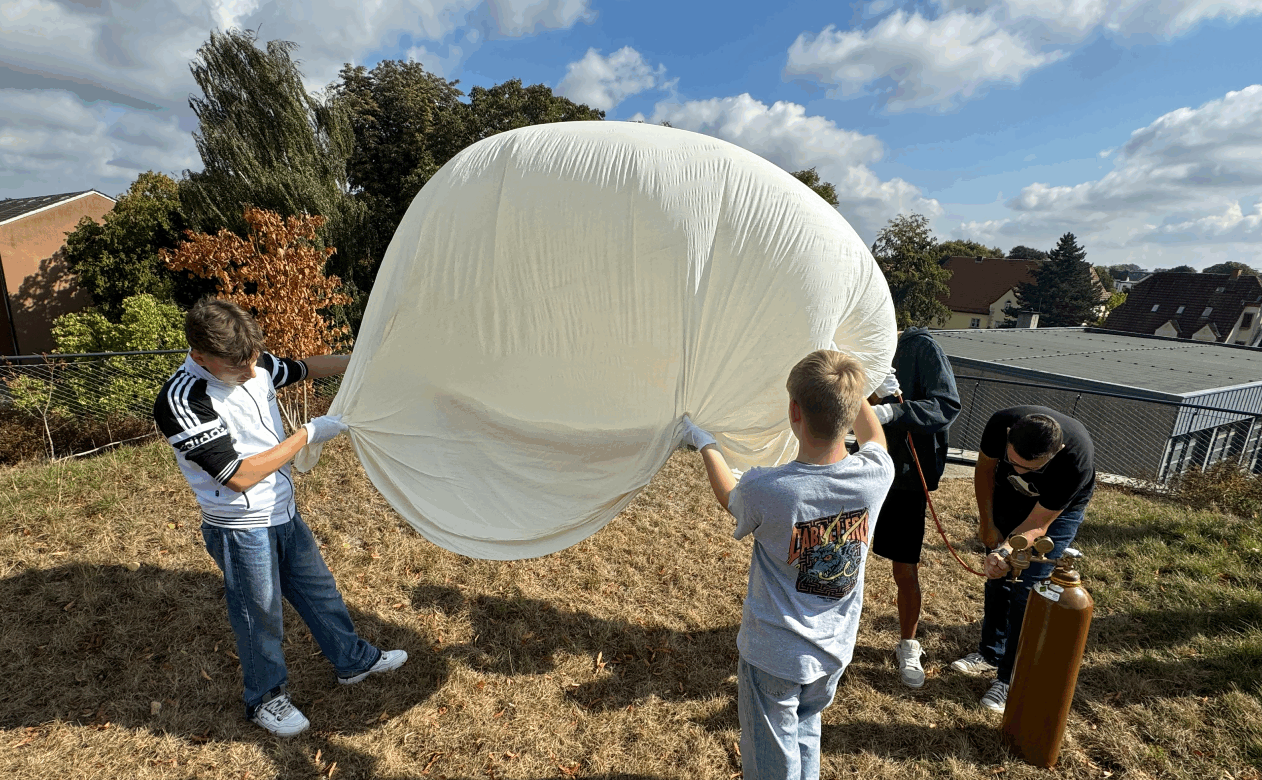 Um 12:02 Uhr war es so weit: Ballon, Fallschirm und eine Sensorbox mit verschiedenen Experimenten erhoben sich in die Luft. Der Start war nicht nur ein technisches Highlight, sondern auch ein Gemeinschaftserlebnis. Viele Schülerinnen und Schüler verließen spontan ihre Klassenzimmer, um dem Start beizuwohnen – Unterricht war in diesem Moment kaum noch möglich.